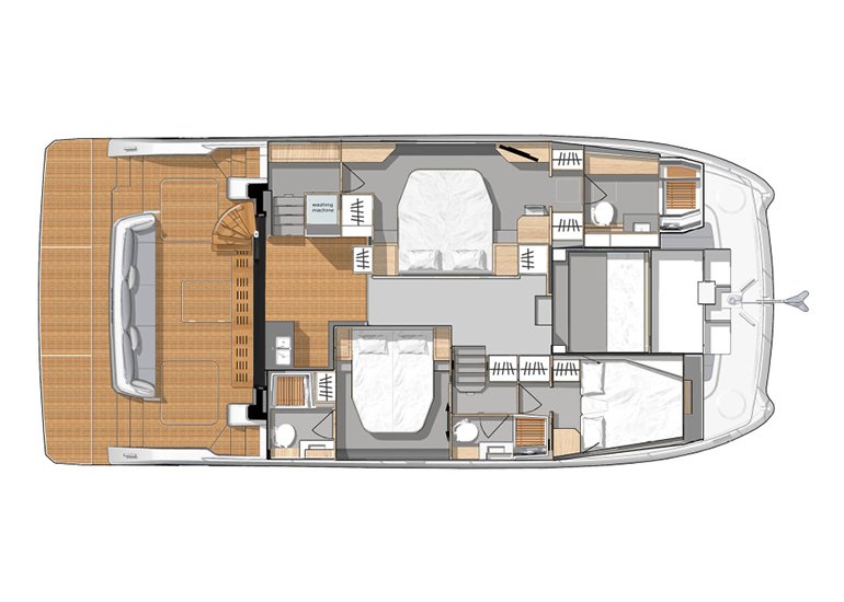Es gibt eine Auswahl an Entspannungs- und Unterhaltungsbereichen an Bord, darunter eine kolossale Flybridge mit Lounges und Esstisch, um das Kreuzfahrterlebnis wirklich zu genießen, ein geräumiges vorderes Cockpit mit Sonnenliegen und Zugang zu den Kabinen, ein erhöhter moderner Salon und ein großzügiges Cockpit, das sich vor der Kombüse öffnet. Zusätzlich gibt es die Option einer festen oder hydraulischen Badeplattform am Heck.